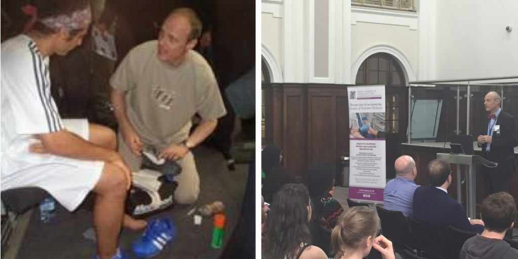 Steve Avil tends to squash ace Amr Shabana and (right) talking about podiatry to students from across England.