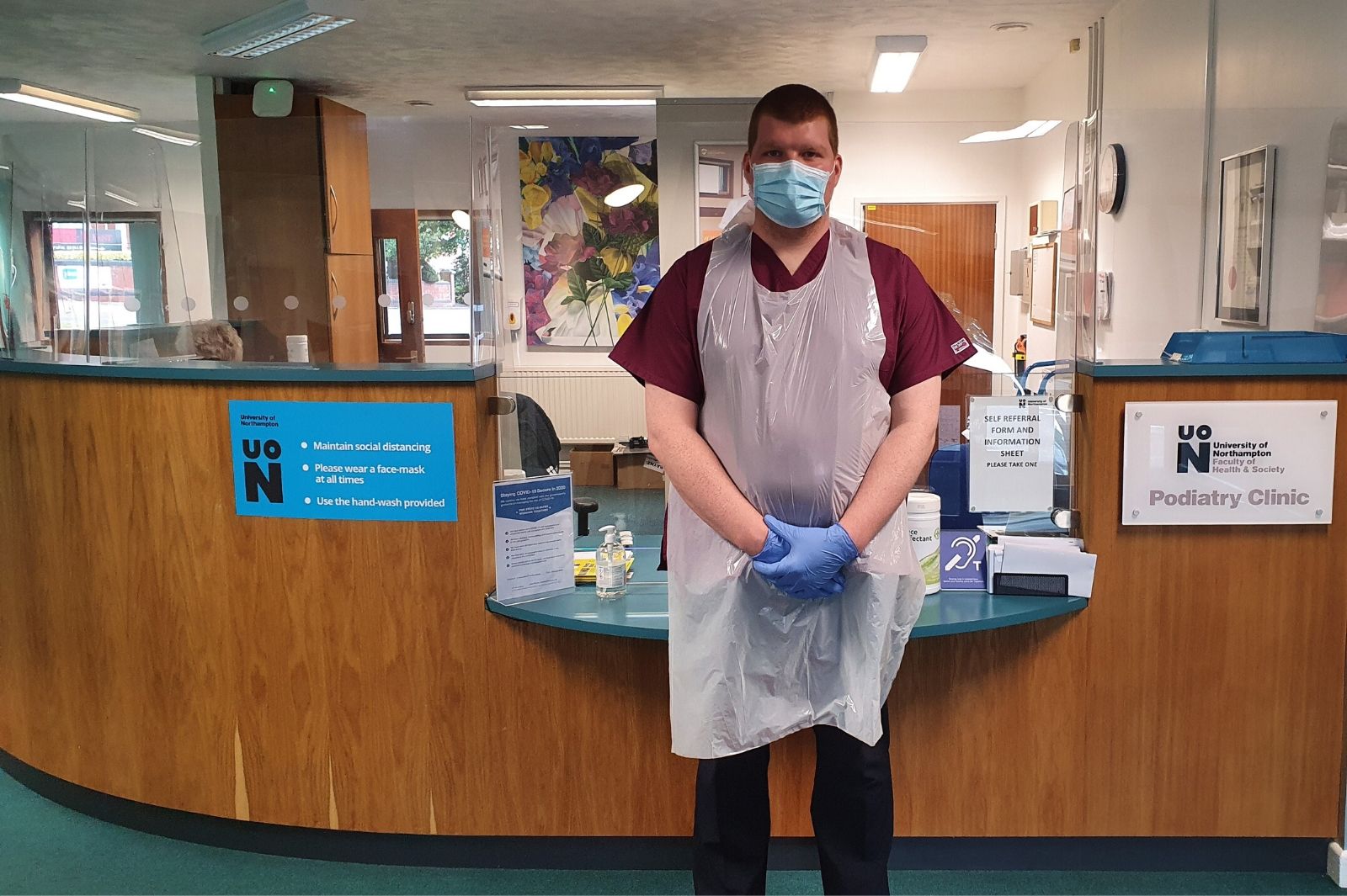Staff members will also need to undergo temperature checks, wear the correct PPE – as modelled in the photo by Dan Watson, Specialist Podiatrist – and clean clinical and waiting room surfaces between each patient.