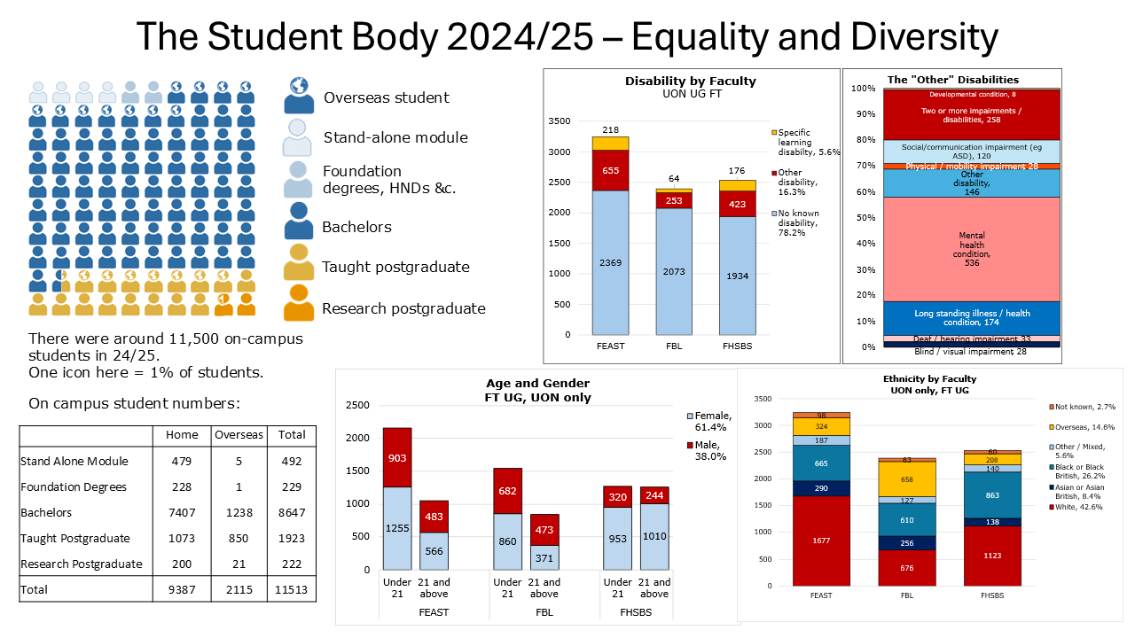 Student diversity profile data for the total number of student enrolments by the University is available to access. Data is provided for the University and broken down by faculty and standard equality variables.