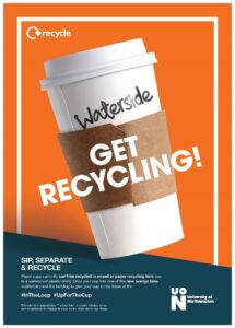 Long description: Waterside: Get Recycling, poster of a paper cup. Text reads: Sip, separate and recycle. Paper cups currently can’t be recycled in mixed paper recycling bins due to a waterproof plastic lining. Drop your cup into one of the new orange bins located around the building to give your cup a new lease of life.