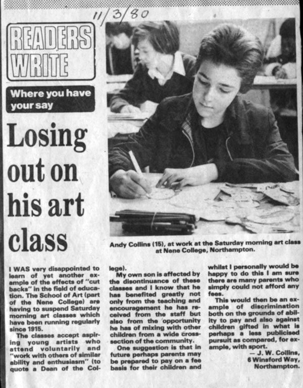 It was too good to last. In 1980, due to education cuts, the classes were stopped. My Dad, a Conservative voter, was outraged enough to write a letter to the Chronicle & Echo, which was printed under a photo taken of a handful of us pretending to draw at desks, and found him banging the drum for state education and egalitarianism: the spectre of a fee-paying version of the classes inspired him to write, “This would be discrimination on the grounds of ability to pay.” I am more proud of him now for writing it than I was even then.
