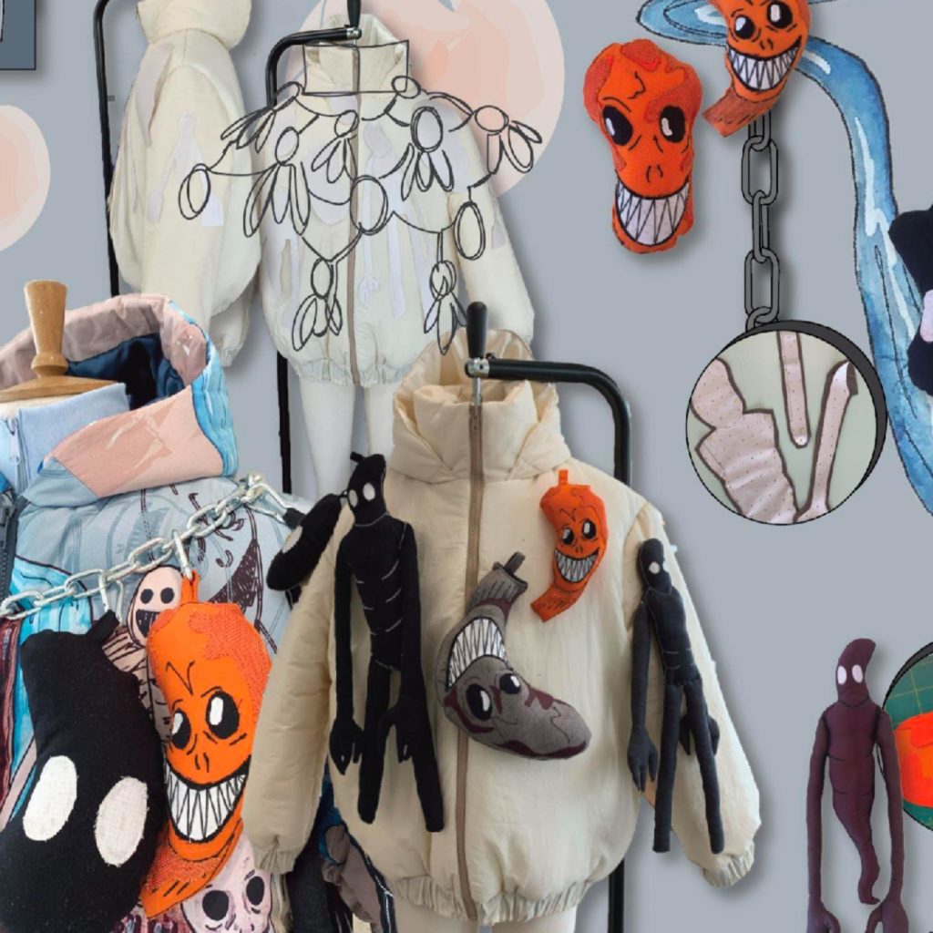 Natasha’s textile prints are inspired by the odd and weird dreams she experienced during the pandemic. Natasha put a request out on social media to ask if others had the same kind of dreams and recorded a mixture of the dreams visually by her hand drawings and paintings. Each piece has a story and the printed and appliqued accessories were named the Dream Stealers by Natasha.