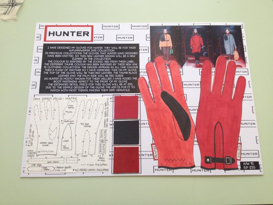 Alice’s brief was to design a pair of Ladies’ fashion gloves for a specific High Street store and provide a suggested retail price and trend research showing how the design and colours were inspired. After looking at several brands, Alice finally selected the Hunter Boot Company. Her glove design was inspired by Hunter’s Autumn/Winter 2015/16 clothing range and as the brand is most known for its wellies, she added the boot fastening aspect to the front of her glove design, with the colour inspired by their iconic red label.