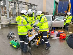 After this warm-up, they then moved onto something more like the real thing, with two staged scenarios around a car accident, where they worked together to rescue multiple patients.