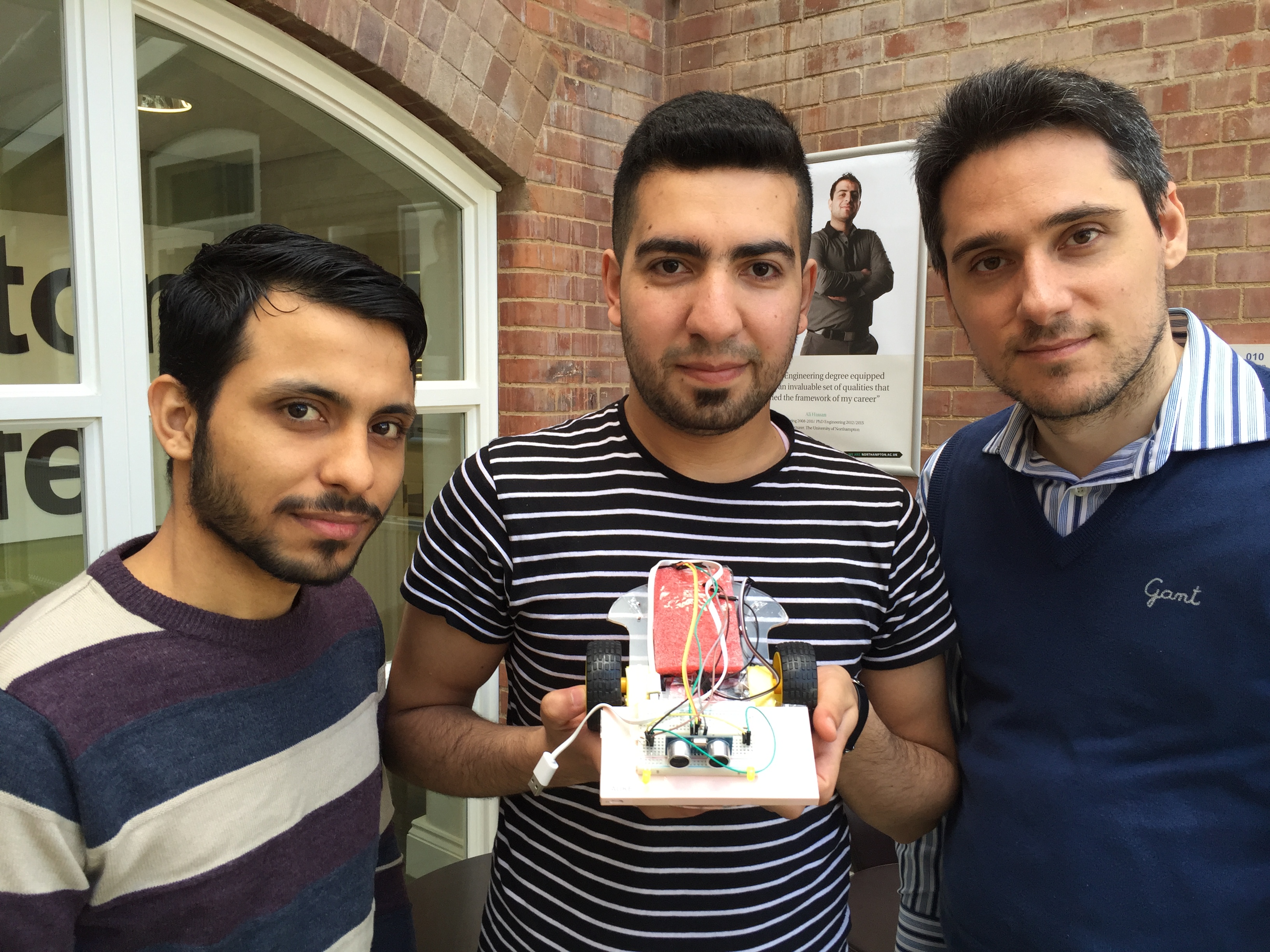 Pictured with the autonomous vacuum cleaner are, from left, Hasan Abo Dihin, Mohammed Al-Khafajiy and Dr Triantafyllos Kanakis.