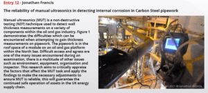 Winner of the Judge’s choice, Jonathan Francis, showcased his research into ‘The reliability of manual ultrasonics in detecting internal corrosion in carbon steel pipework’, his striking image of a web of pipes evokes the sense of the health and safety challenges facing the oil and gas industry in terms of safe operation of assets in the UK energy supply chain. It was like an everyday snapshot that reveals how research is often hidden in plain sight, informing much of what we do and take for granted.