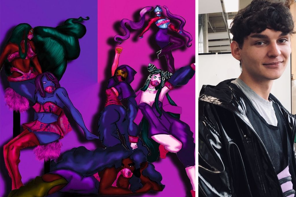 Konrad’s rationale for his design, which appeared alongside the image, reads as follows: “My final collection is influenced by the LGBTQ community, immigrants, people of colour and anyone who experiences hate. I want to show that they shouldn’t be described as different but as extraordinary. My cover illustration was inspired by six of my extraordinary friends: Ieva, Nifemi, Marium, Nazia, Halima and Zazzka. I think it takes more than one person to make a change, but only one to start a change. In these uncertain times, we need to put our differences aside and unite as one.”