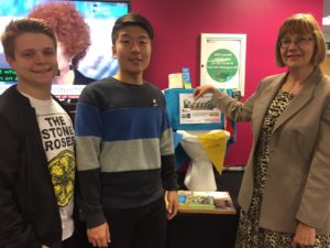 Students’ Union vice presidents David Lewis and Danjie Zhong are pictured with French teacher Catherine Wendeler, promoting the Toilet Twinned Universities scheme.