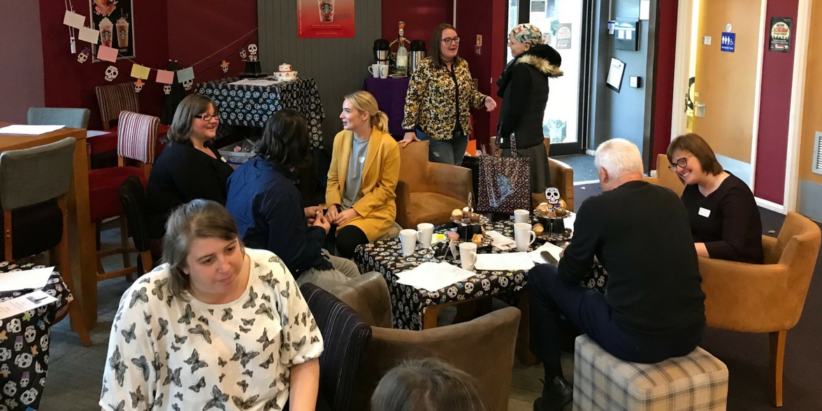 Guests gathered in small groups to discuss death related topics with free tea, coffee and cake provided to help generate talking.