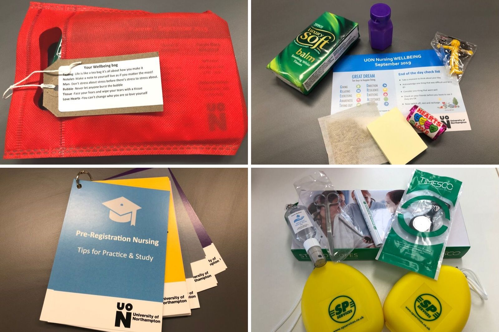(Clockwise from top left): Well-being bag and contents, clinical skills bag contents and nursing student’s ‘uni hacks’ ring file.