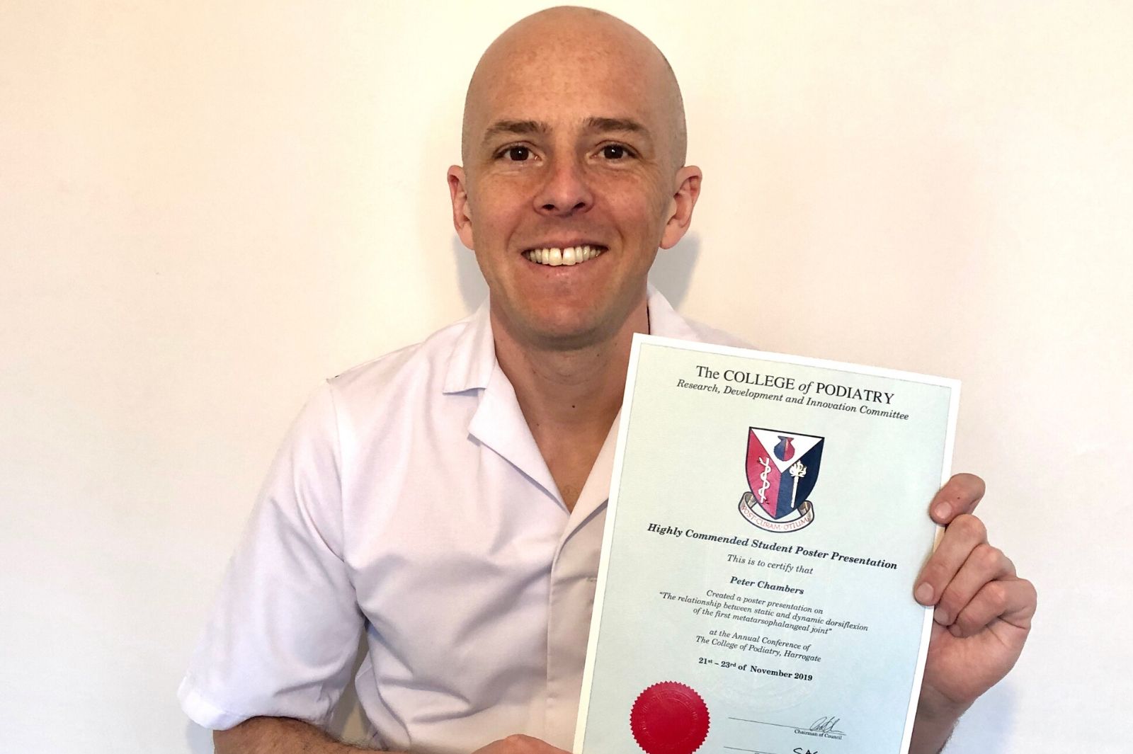 Pete’s career sidestep has already received an official seal of approval. At the College of Podiatry Conference 2019, Pete’s poster presentation about his undergraduate research received a ‘Highly Commended’ citation from the college.
