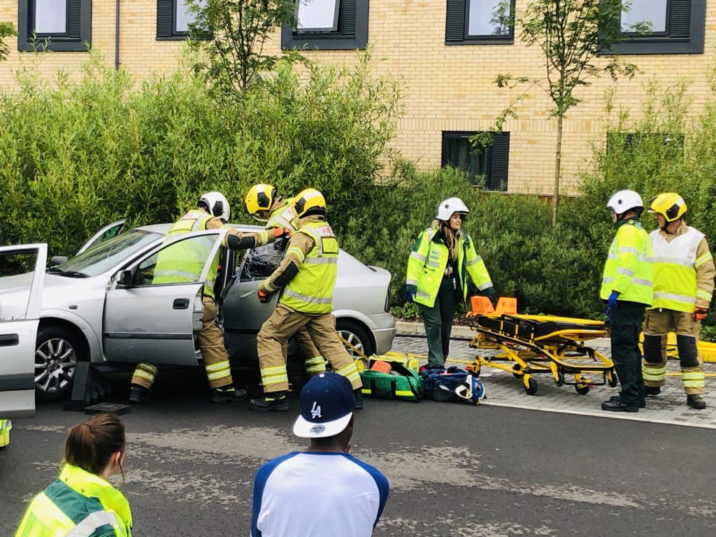 For safety reasons the ‘crash’ had already happened, so students instead witnessed the high-action minutes immediately following it, with some of the actors arrested at the scene by officers from the Northamptonshire Police force and witnessed members of Northamptonshire Fire and Rescue ‘extricating’ a person trapped in a car.