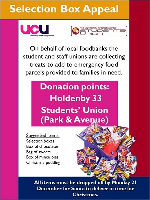 The Students’ Union and University and College Union are collecting donations of selection boxes, bags of sweets, boxes of chocolates, mince pies and Christmas puddings, which will be added to emergency food parcels provided to families in need.