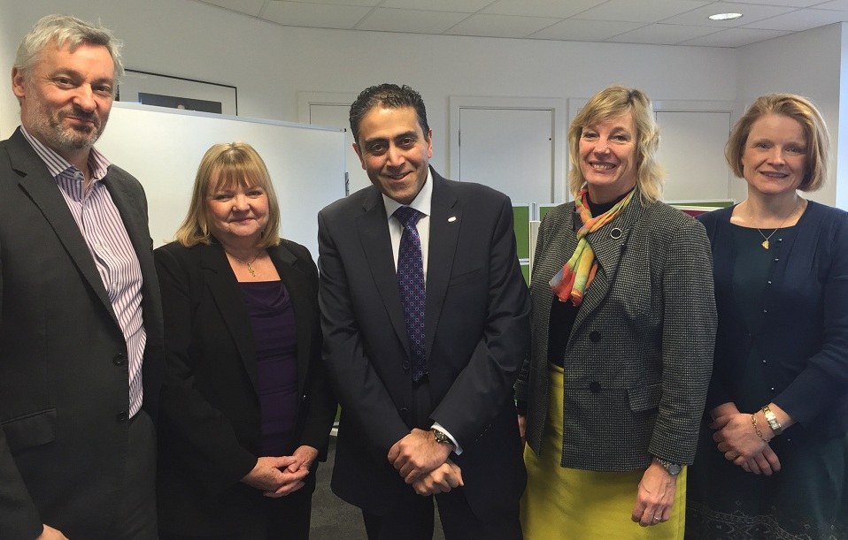 Pictured from left: Vice Chancellor Nick Petford, Senior Lecturer in Information Technology Service Management, Sandra Whittleston, Ash Merchant, Fujitsu Director of Education, Northamptonshire Growth Hub Manager, Janette Pallas, and Mairi Watson, Deputy Dean, Northampton Business School.