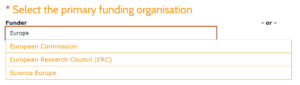 Long description: Select the primary funding organisation with 3 options: European Commission, European Research Council (ERC) or Science Europe