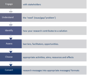 Long description: Diagram that shows how to generate Impact. Engage with stakeholders. Understand the need (issue/gap/problem). Identify how your research contributes to a solution. Assess barriers, facilitators, opportunities. Choose appropriate activities, aims, resources and effects. Convert research messages into appropriate messages/formats.