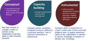 Long description: A diagram that shows 3 types of Impact; Conceptual, contributing to the understanding of policy issues, refraining debates. May lead onwards to changes in policy or practice as key stakeholders build their ability to make informed decisions. Capacity building, through technical and personal skill development. Changed policies, guidelines; increased funding or staffing for a particular approach; new or improved interventions or programmes. Instrumental, influencing the development of policy, practice or service provision, shaping legislation, altering behaviour. Increased ability of researchers to conduct similar work in future and build evidence base. Increased awareness/ability of key stakeholders or partners to use the knowledge or research or develop new knowledge.