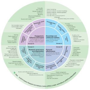 Image long description: Circle which shows the different elements required for the Vitae Researcher Development Framework. This includes four domains, which each have three further sections: A: Knowledge and intellectual abilities (A1: Knowledge base A2: Cognitive abilities. A3: Creativity). B: Personal Effectiveness (B1: Personal qualities B2: Self-management B3: Professional and career development). C: Research governance and organisation (C1: Professional conduct C2: Research management C3: Professional conduct). D: Engagement, influence and impact (D1: Working with others D2: Communication and dissemination D3: Engagement and impact). For more information about the framework, please visit The Vitae Researcher Development Framework website.