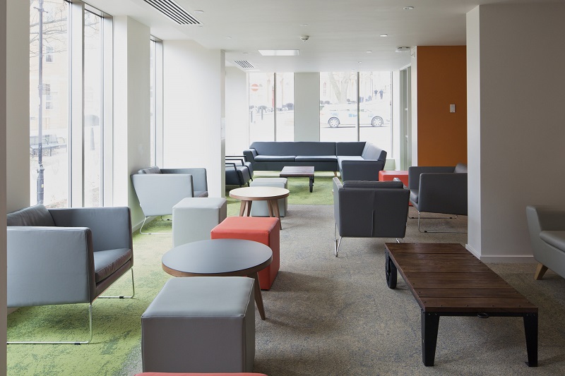Photo shows the open plan view of a single studio flat in St John Halls, featuring a bed, desk and chair, and kitchenette.