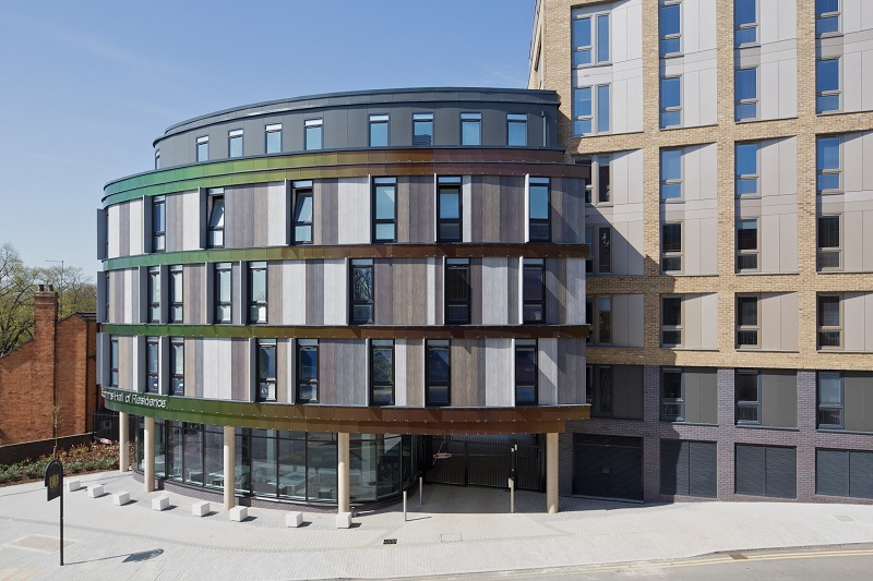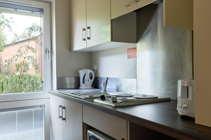 Photo shows close up of kitchenette (including sink, cupboards, hob, and toaster) and window in single studio flat in St Johns Halls