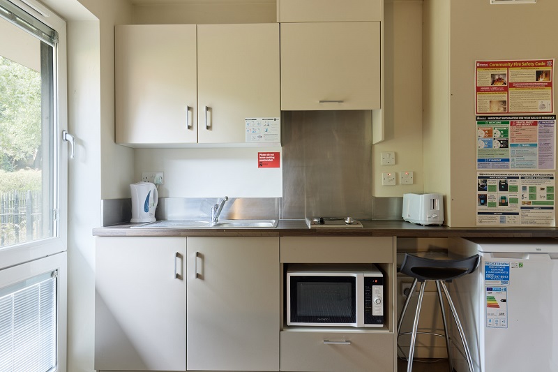 Photo shows kitchenette (including sink, cupboards, hob, microwave, stool and fridge) in single studio flat in St Johns Halls