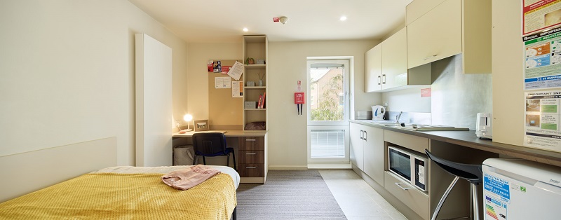 Photo shows the interior view of a single studio flat in St John Halls, featuring a bed, desk and chair, and kitchenette.